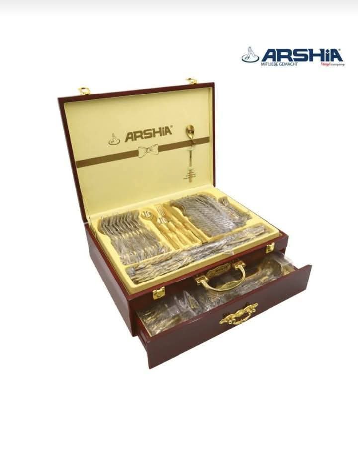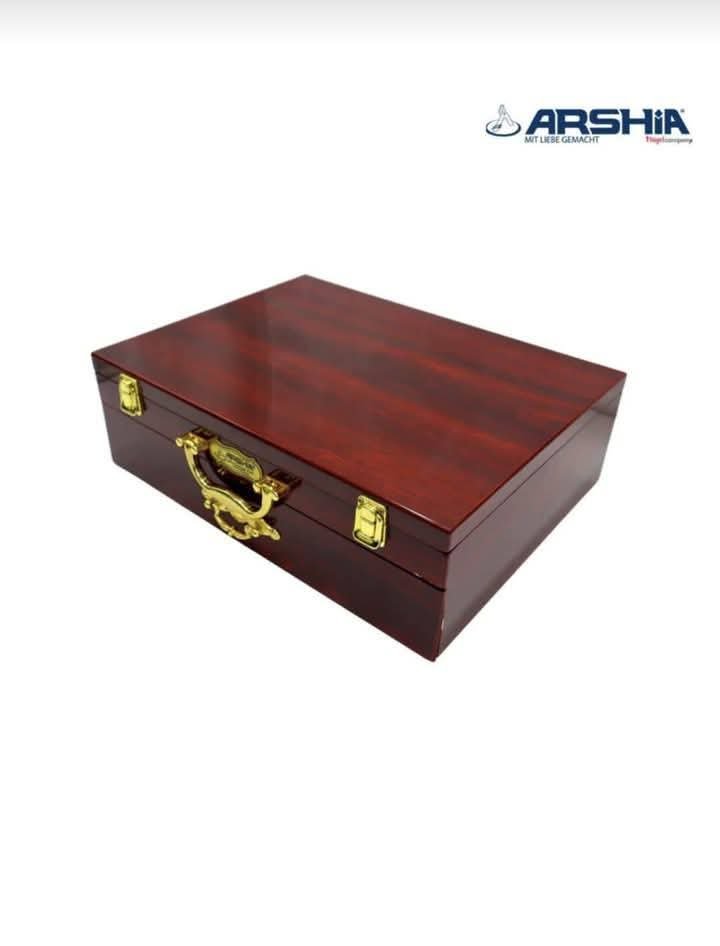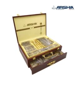 يأتي هذا الطقم الفاخر في صندوق خشبي أنيق، مما يجعله إضافة مميزة لمطبخك أو هدية مثالية للمناسبات الخاصة. يحتوي الطقم على مجموعة متنوعة وشاملة من أدوات المائدة لتلبية جميع احتياجاتك، بما في ذلك ملاعق وشوك وسكاكين لمختلف الاستخدامات.