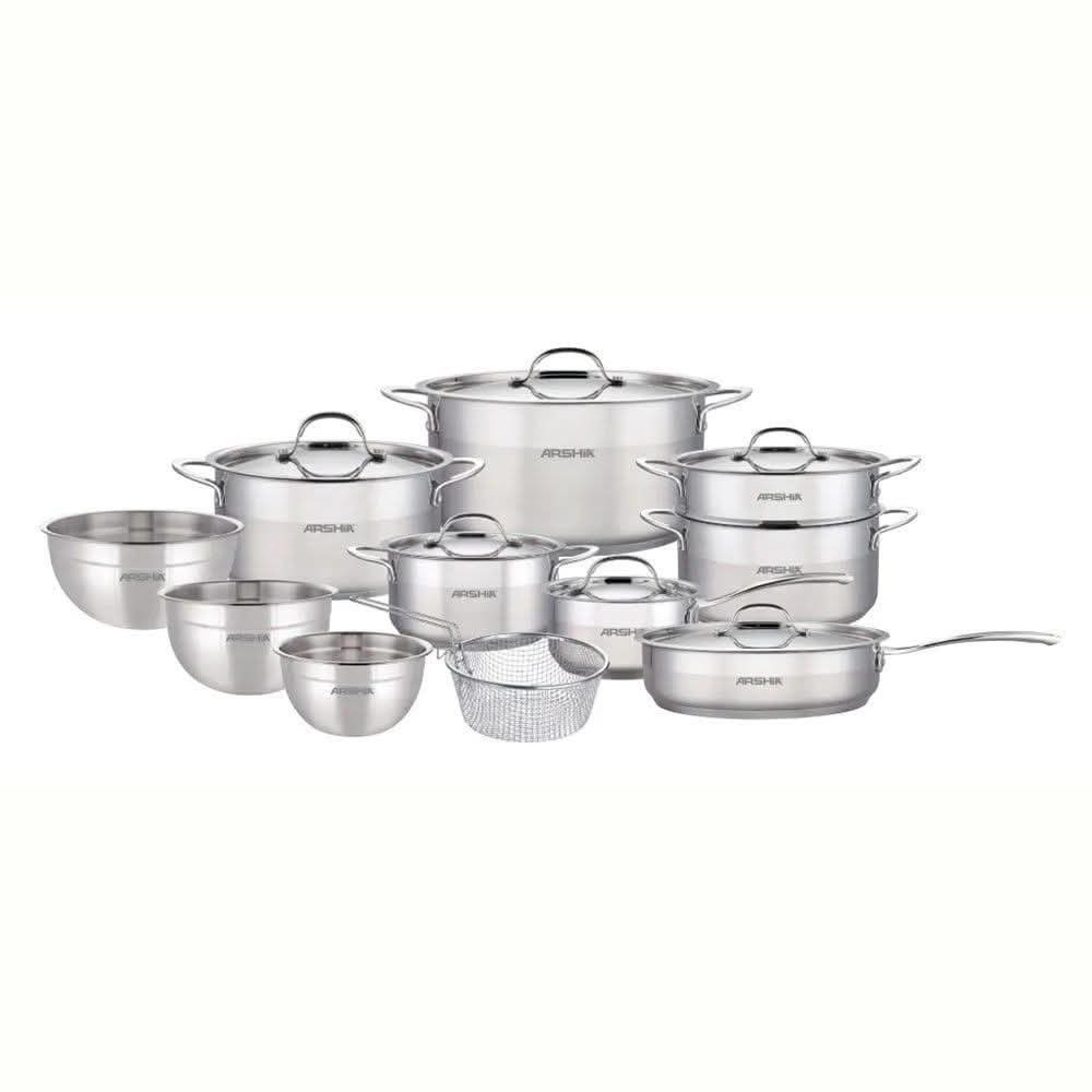 طقم حلل متكامل مصنوع من ستانلس ستيل 18/10 عالي الجودة، مصمم ليمنحك تجربة طبخ احترافية وسهلة. مناسب لجميع أنواع البوتاجازات، ويوفر توزيع حرارة متساوٍ لطهي مثالي.