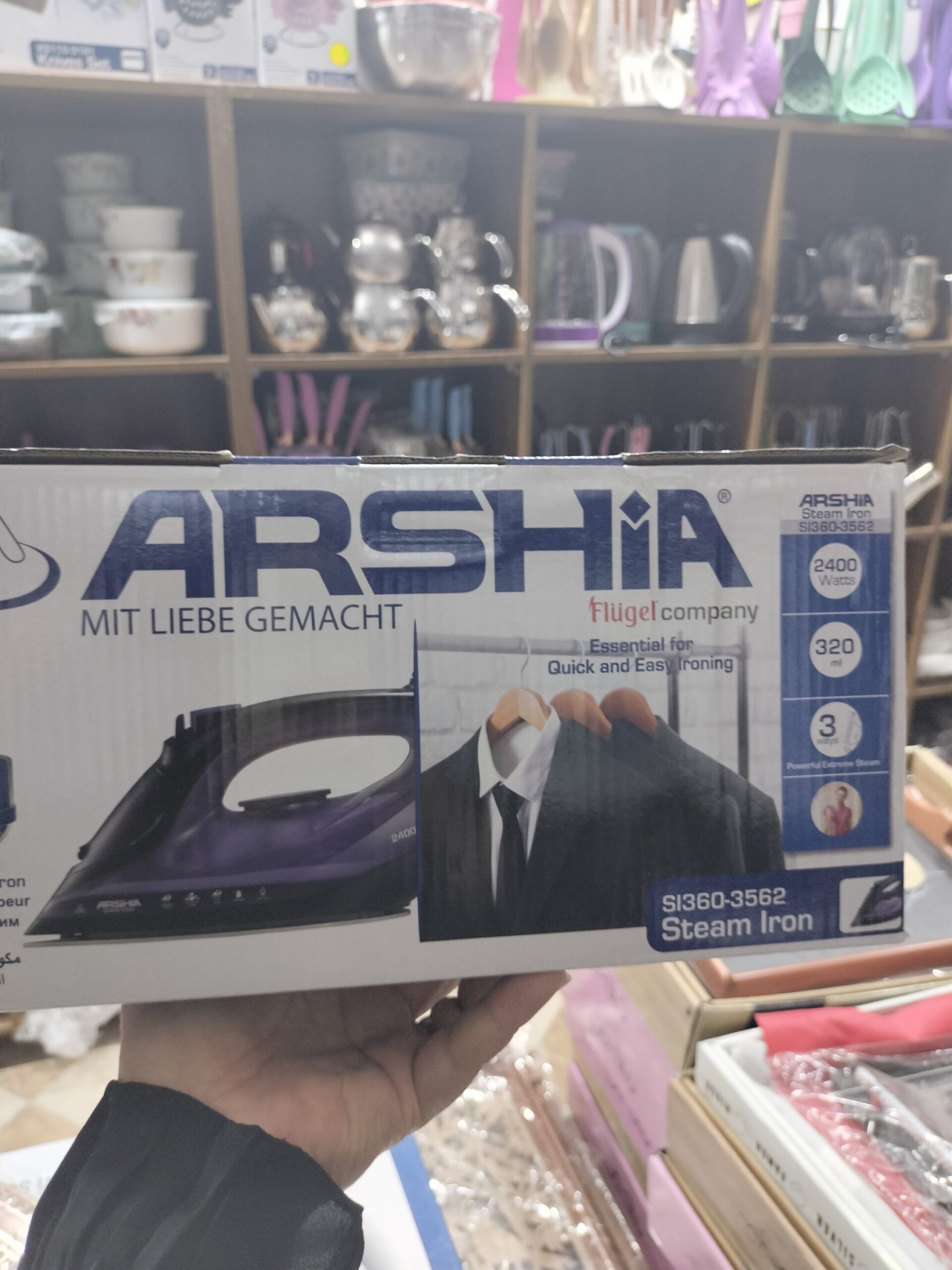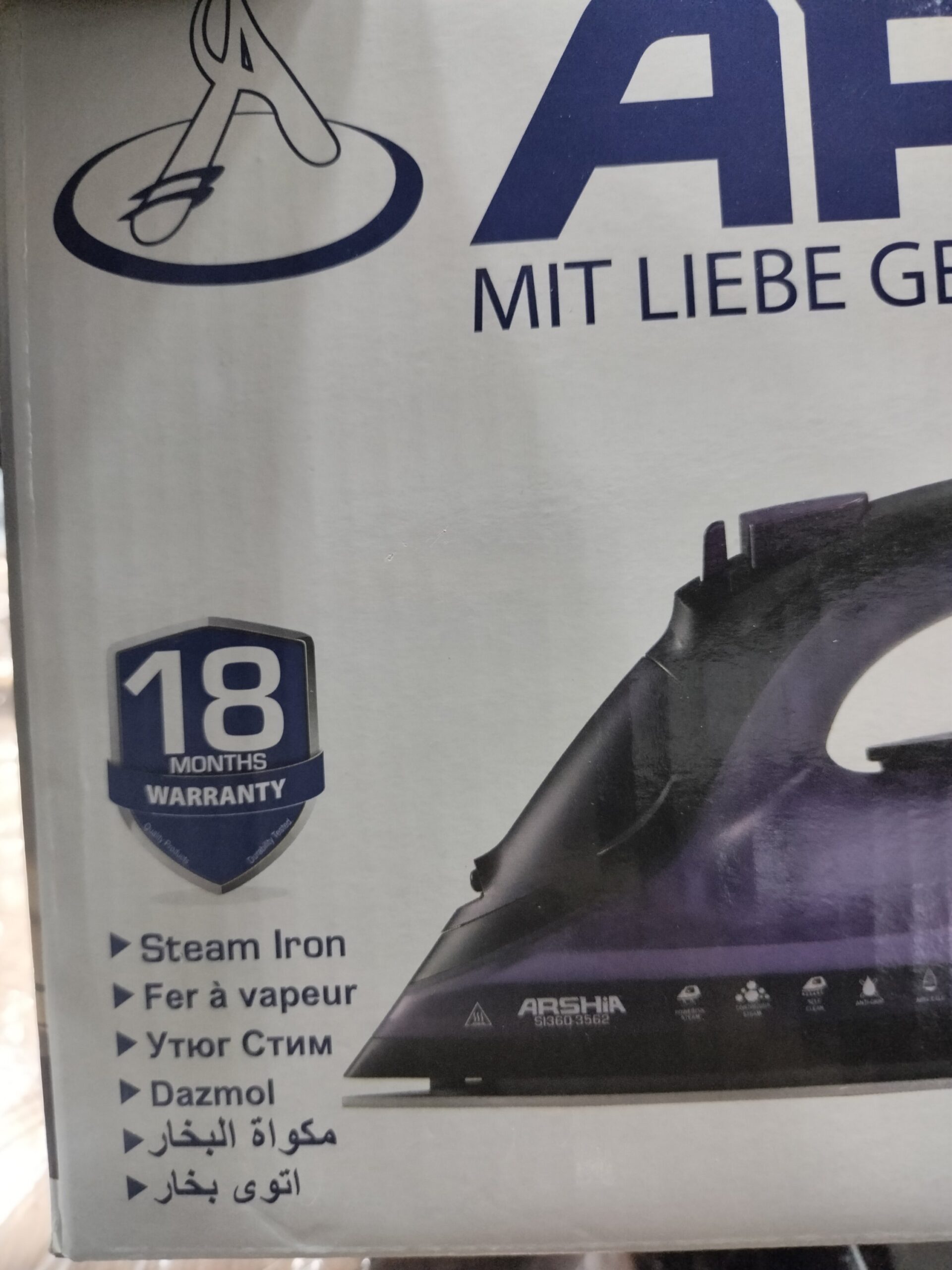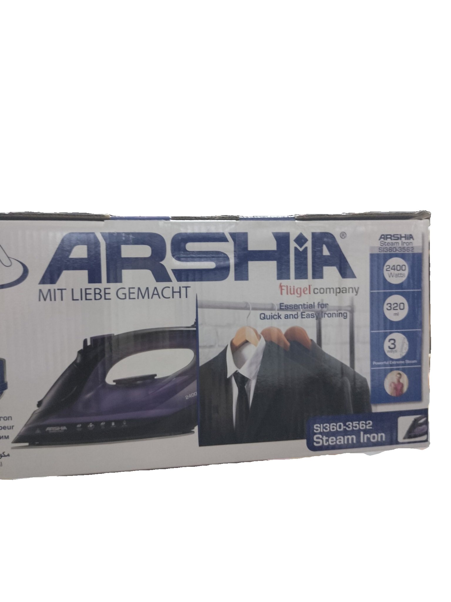مكواة بخار من ماركة Arshia، الموديل SI360-3562، وهي من المنتجات الأصلية التابعة لشركة Flügel Company.