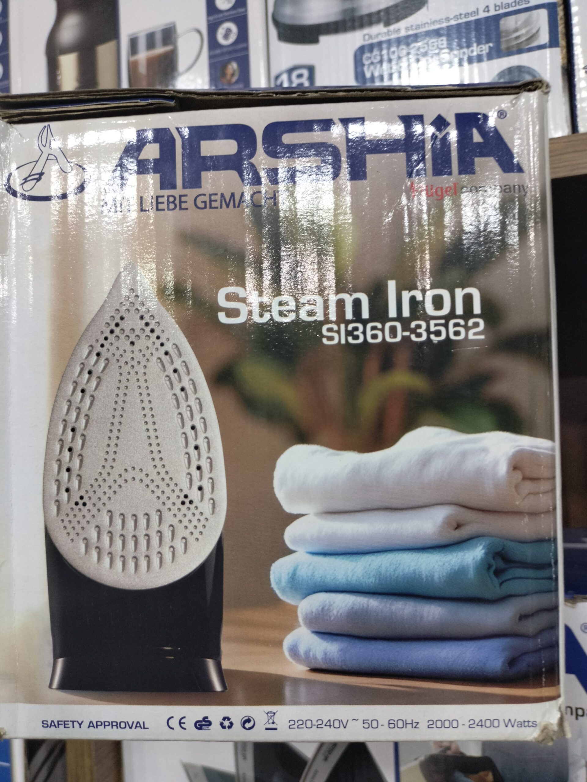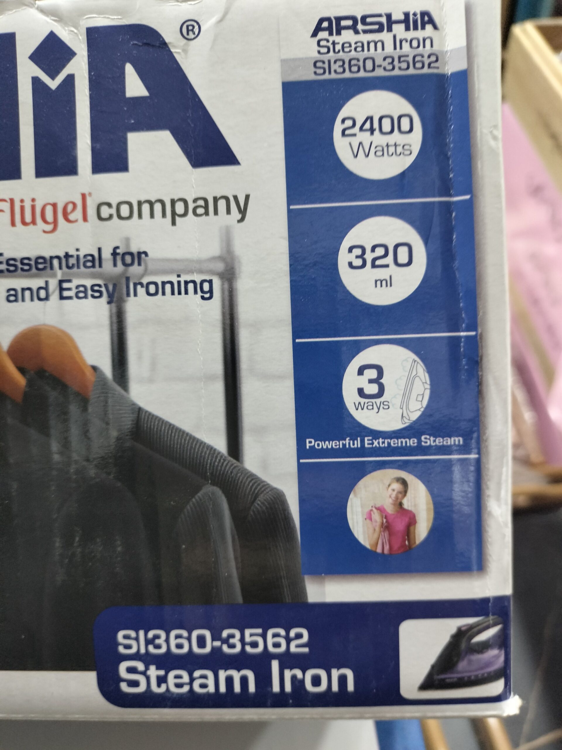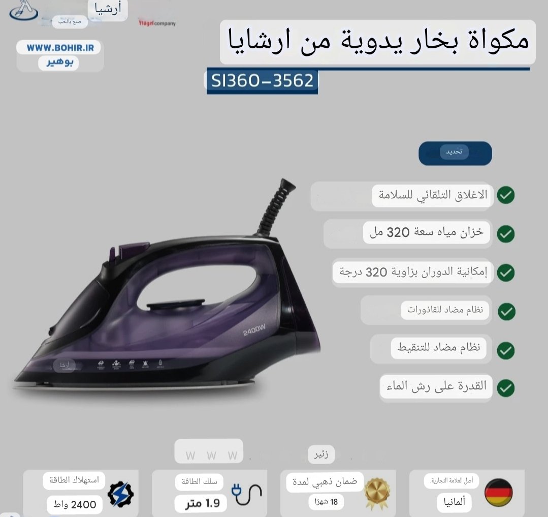 مكواة بخار من ماركة Arshia، الموديل SI360-3562، وهي من المنتجات الأصلية التابعة لشركة Flügel Company.