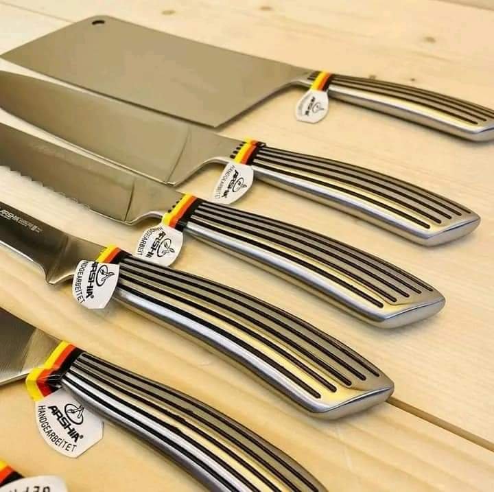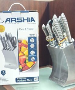 ارتقِ بتجربة الطهي مع طقم السكاكين الألماني الأصلي من Arshia – 10 قطع مصنوعة من فولاذ ألماني عالي الجودة (X50CrMoV15)، بحدة فائقة ومتانة لا مثيل لها. يتميز الطقم بشفرات دقيقة، تصميم كامل الطول (Full Tang) لتحقيق توازن مثالي، ومقابض مريحة لتقليل التعب أثناء الاستخدام.