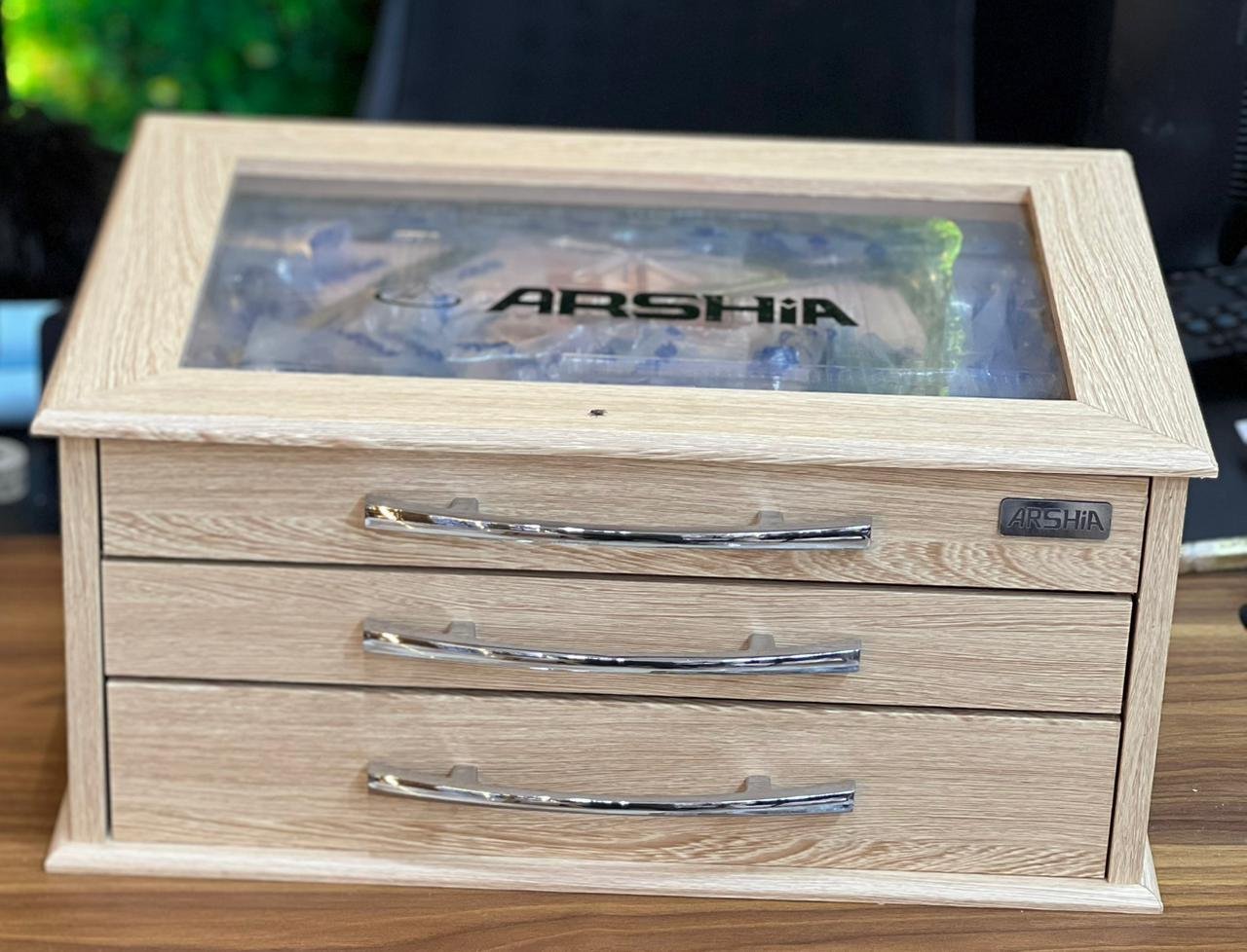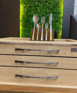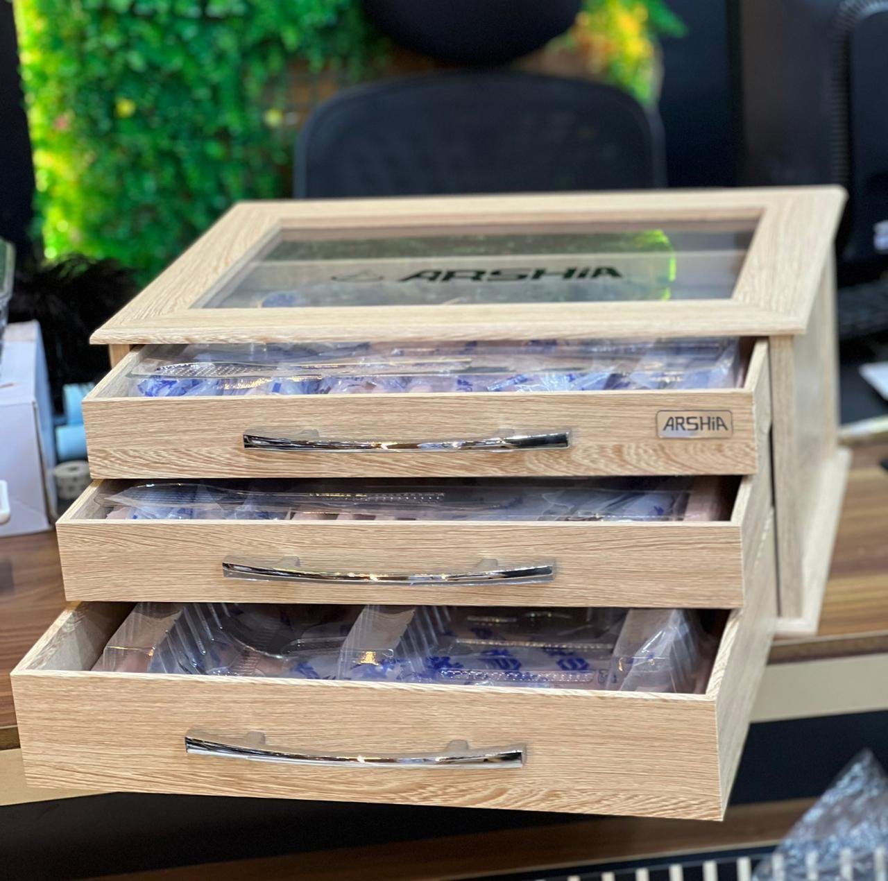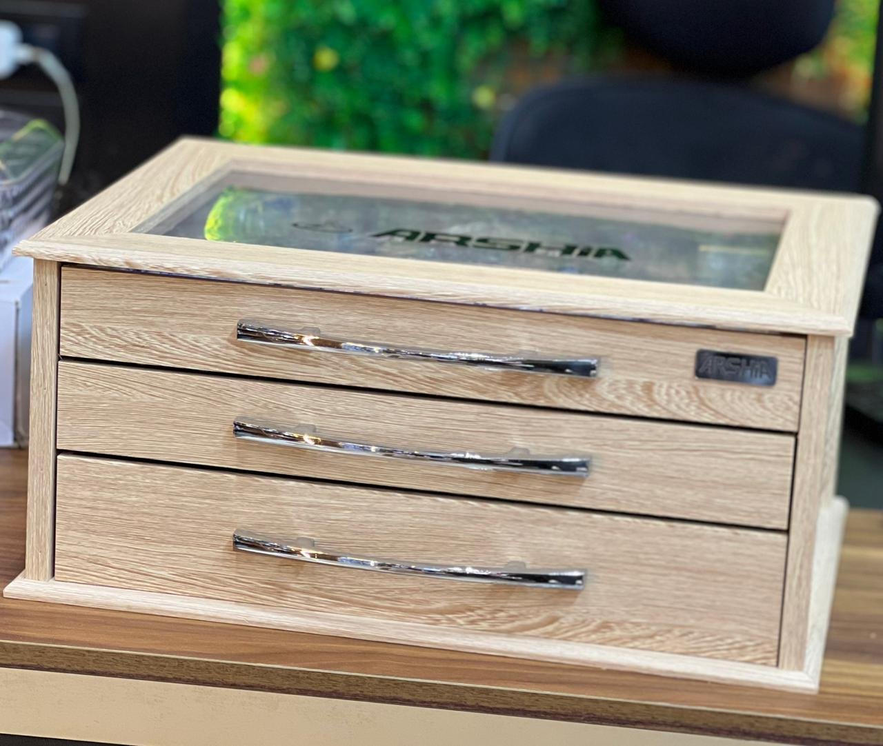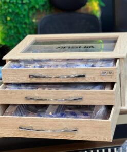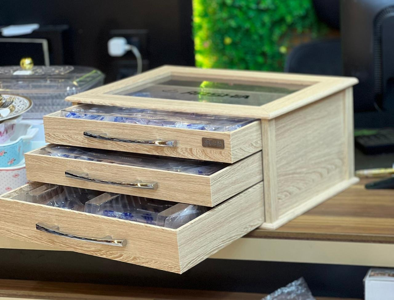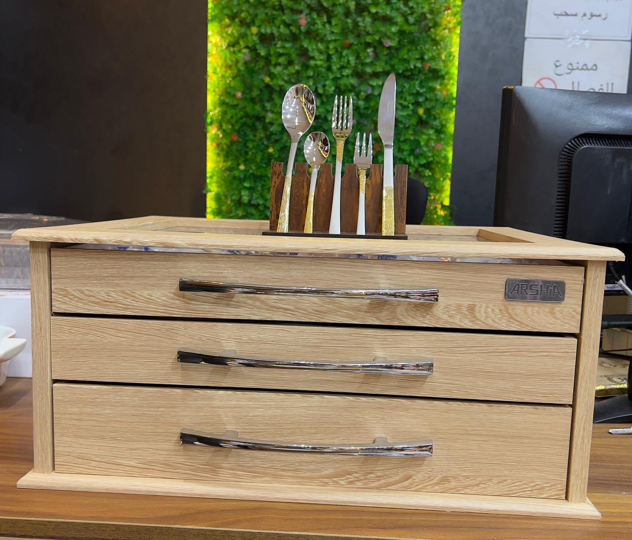 صندوق خشبي أنيق: يأتي الطقم في صندوق خشبي عملي بثلاثة أدراج، يحمي القطع من الخدوش ويسهل تنظيمها وتخزينها بأناقة.