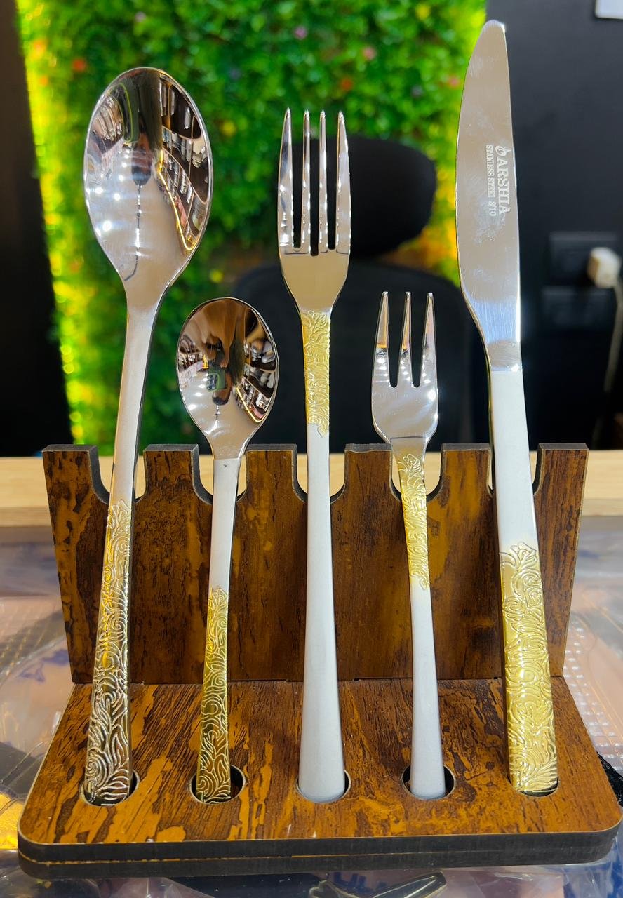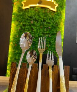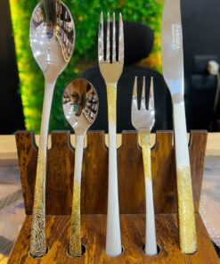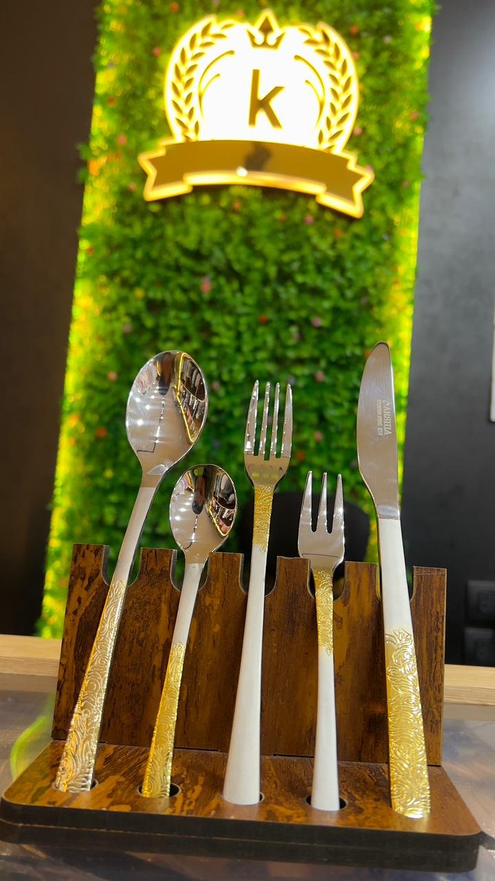 تصميم أنيق: كل قطعة في هذا الطقم مصممة بعناية فائقة وتفاصيل زخرفية مميزة على المقبض، لتمنح مائدتك لمسة من الفخامة والرقي.