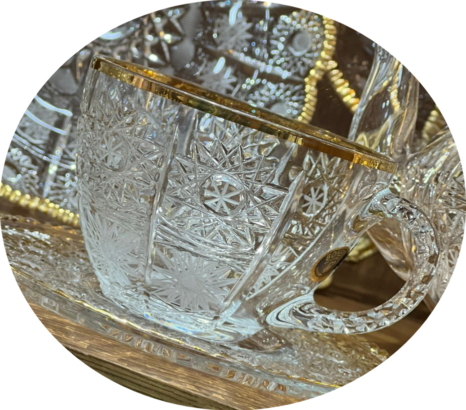 لكل سيدة بتبحث عن الأناقة في تقديماتها، معرض كريم للأدوات المنزلية بيقدم لك أفخم طقم شاي وجاتوه (24 قطعة) من الكريستال البوهيمي الأصلي المرصع بالذهب.