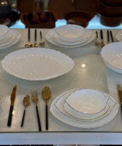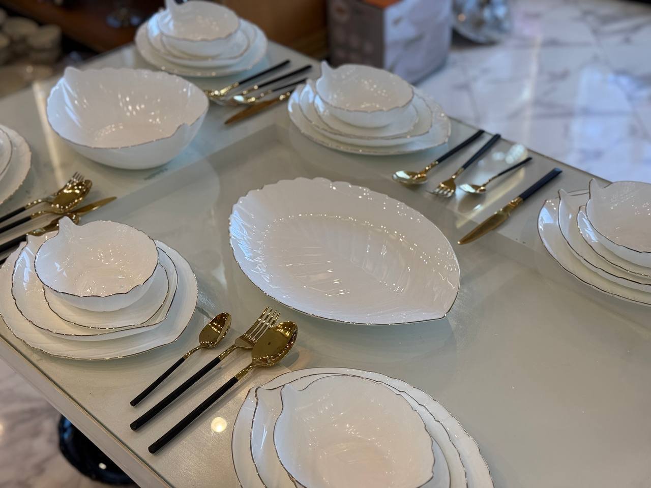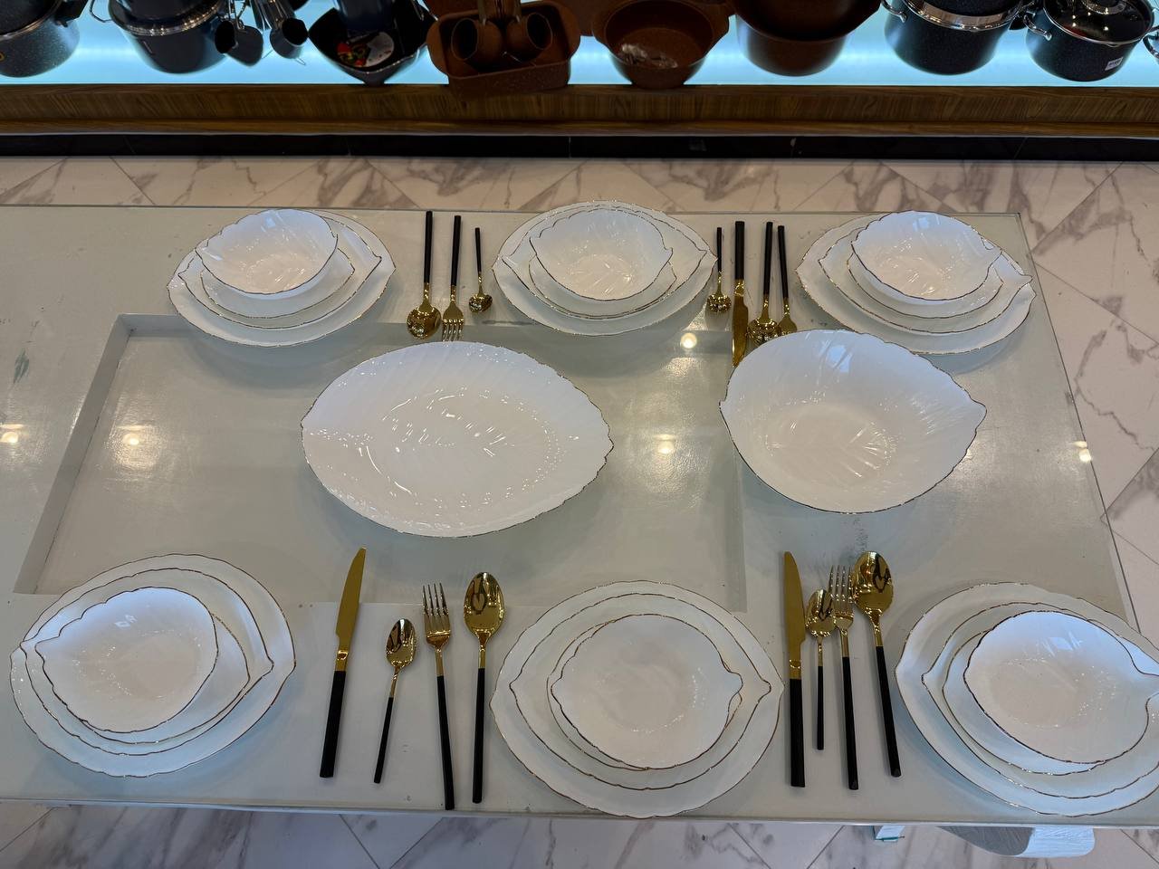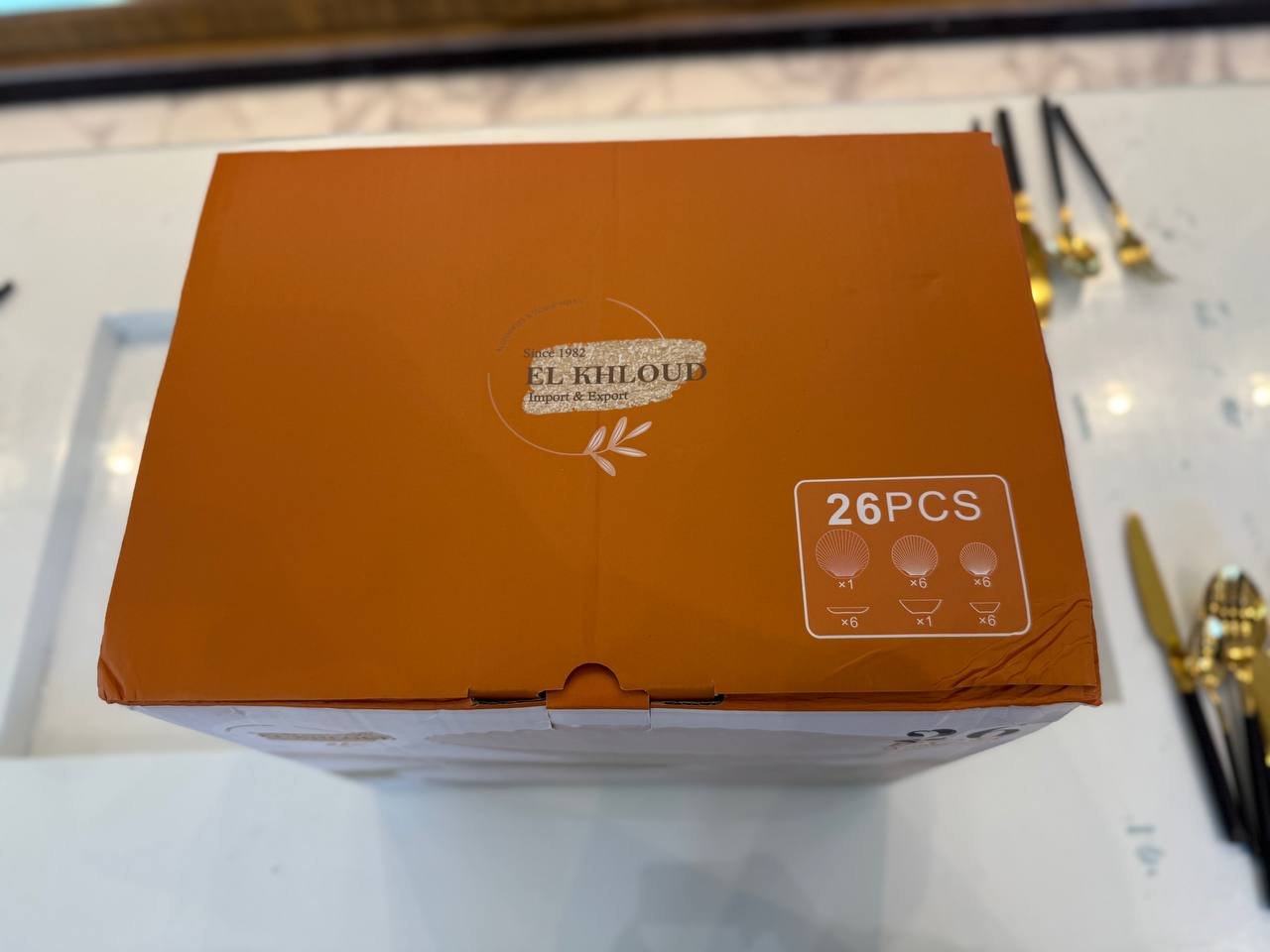 نقدم لكم طقم عشاء EL KHLOUD الجديد المكون من 26 قطعة. بتصميمه الفريد على شكل أوراق شجر وحواف ذهبية، هذا الطقم يمنحك تجربة طعام لا تُنسى. مثالي للمناسبات الخاصة والاستخدام اليومي.