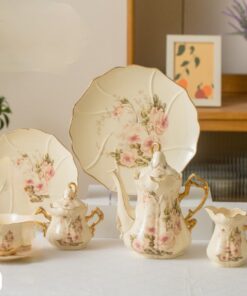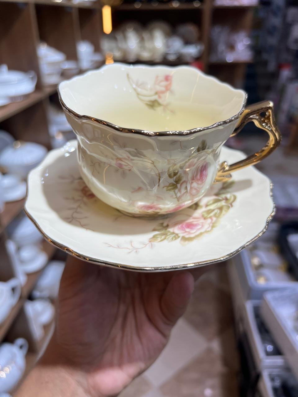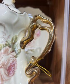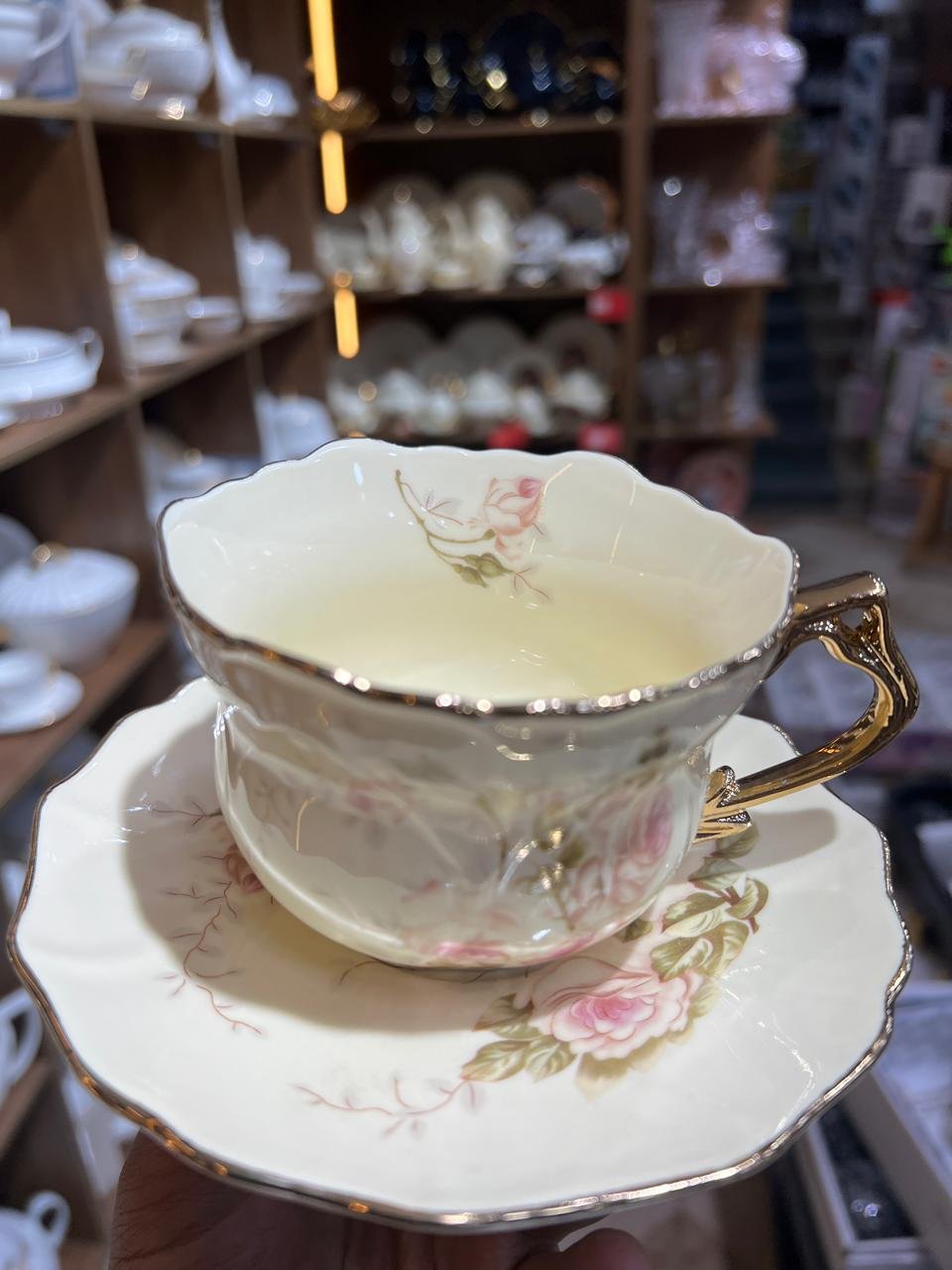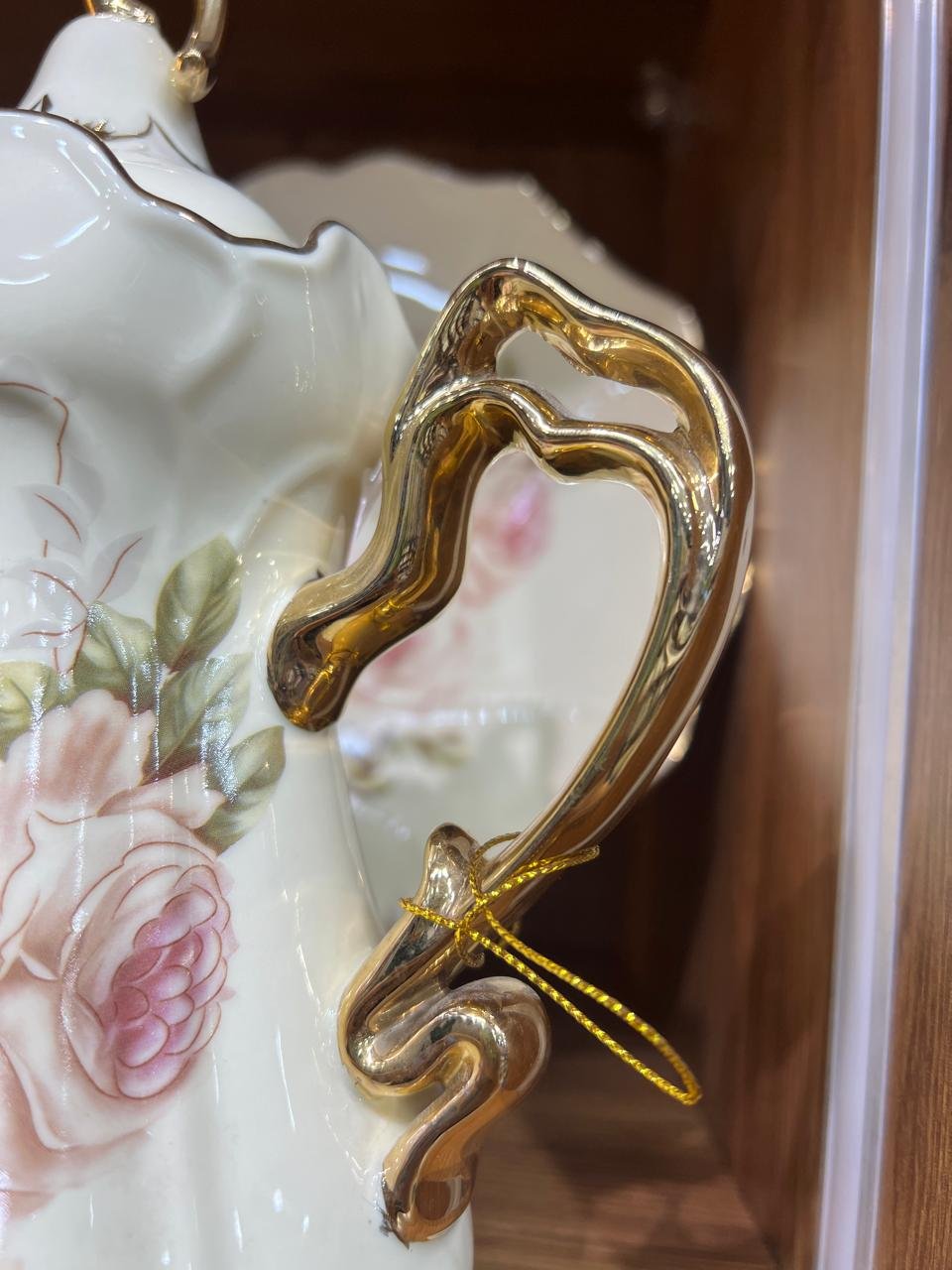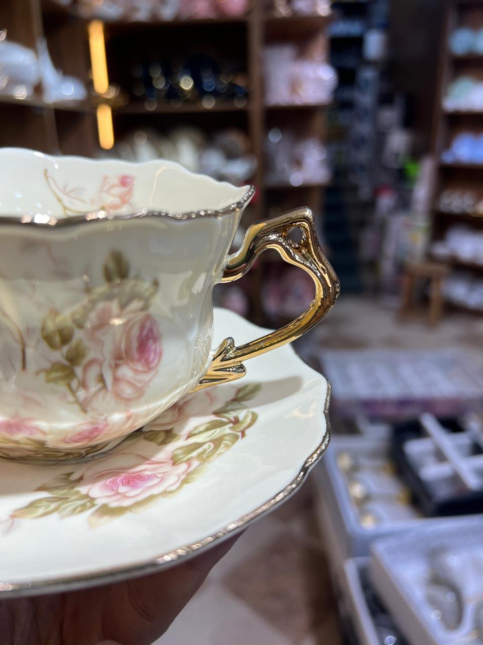 طقم شاي وجاتوه 24 قطعة، تصميمه راقي جداً، مزخرف بنقوش ورود وردية ساحرة ولمسات دهبية لامعة على الأطراف والمقابض تضيف لمسة ملكية تخلي سفرتك قطعة من القصور 👑.